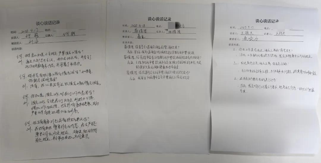 公司各部門組織開展全覆蓋式涉酒等風(fēng)險隱患排查,通過“一對一”談話、“面對面”提醒等方式,深入排查重點人員、關(guān)鍵環(huán)節(jié),確保風(fēng)險隱患無遺漏、無死角。